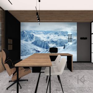 LOKAL BIUROWY Gabinet prezesa Inspiracją był górski krajobraz, przeniesiony do wnętrza w formie dużej grafiki i stonowanej palety barw. Ważne