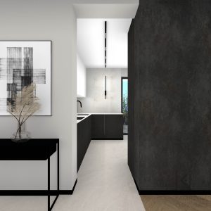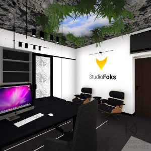 LOKAL BIUROWY Studio graficzne Inspiracją była śmiała, nowoczesna estetyka — ciemna paleta, surowe faktury i akcenty roślinne. Razem tworzą one