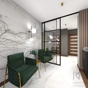 LOKAL USŁUGOWY Kancelaria Adwokacka Inspiracją były elegancja, naturalne materiały i światło: drewno, kamień, metal połączone z zielenią oraz szklanymi przegrodami,