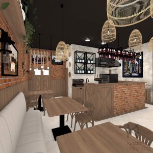 LOKAL USŁUGOWY Restauracja Chinkalnia Inspiracją były tradycyjne, gruzińskie klimaty — rustykalne materiały, cegła, ciepło drewna i folklorystyczne detale. Zamawiającym zależało,