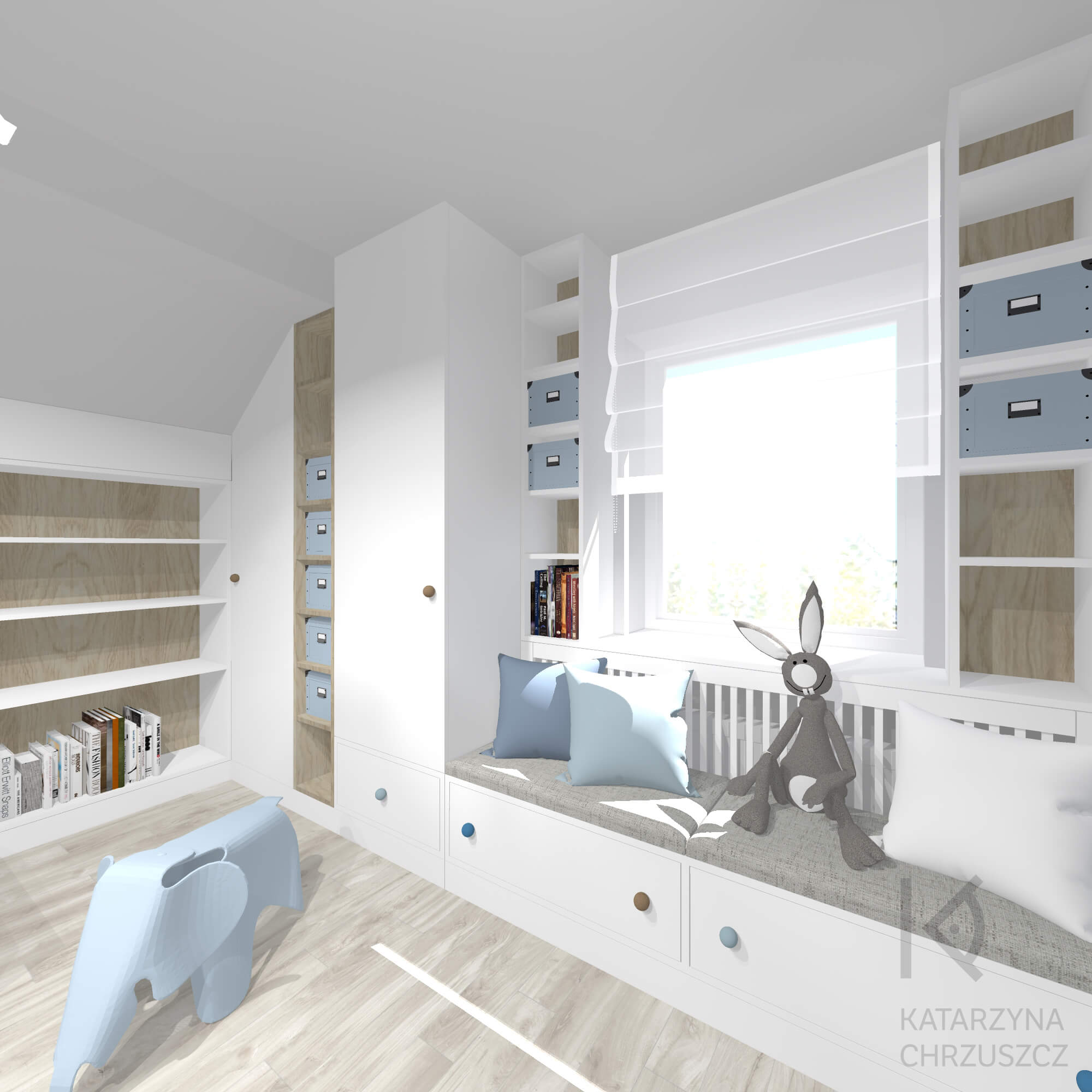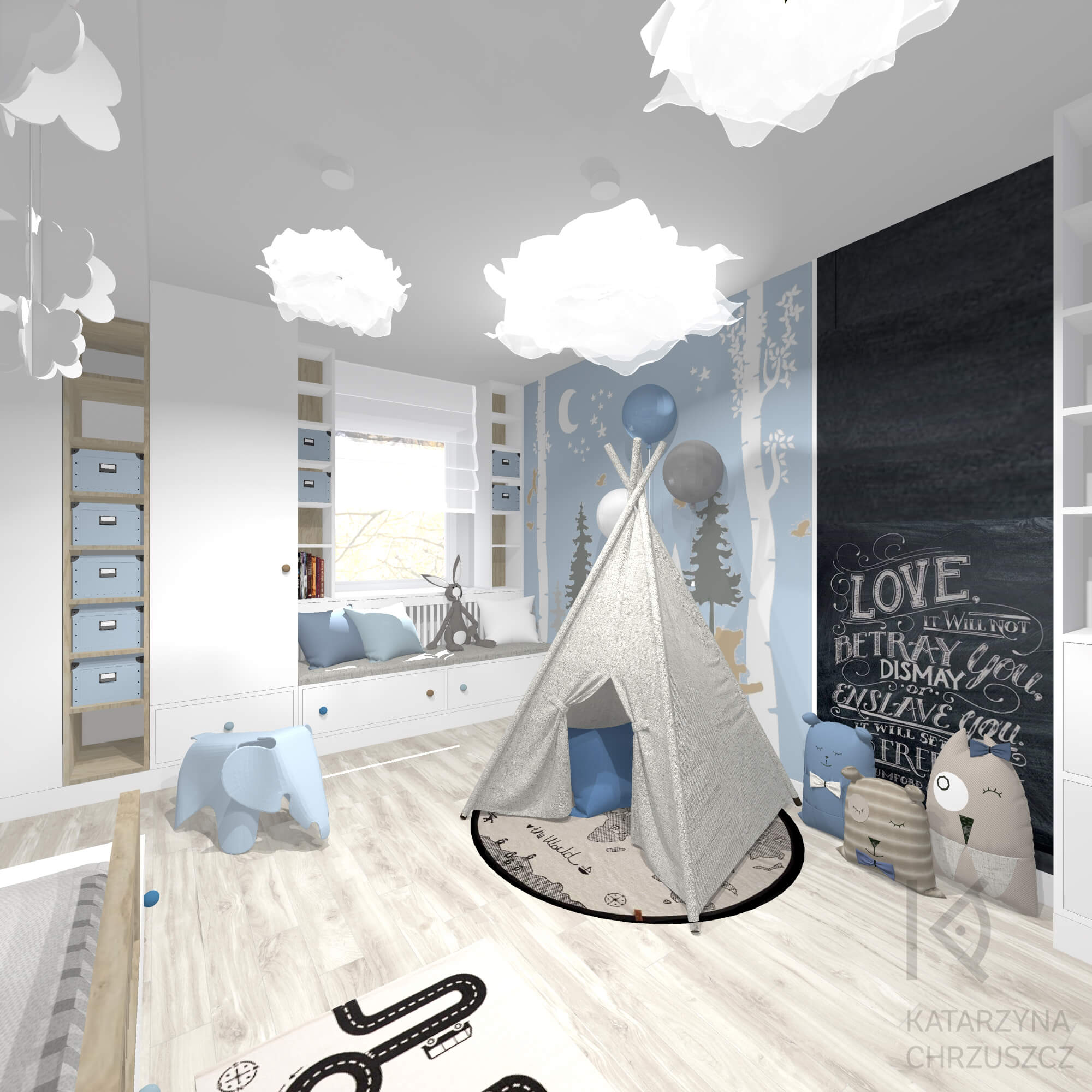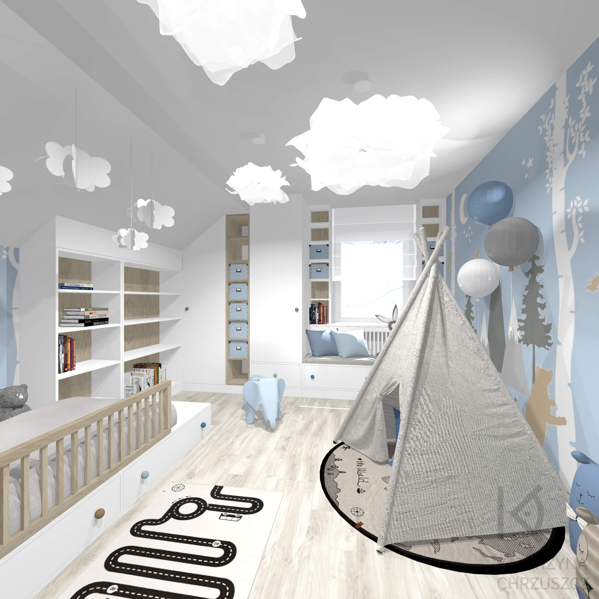 W centralnej części pokoju postawiłam się przytulny namiot tipi, który staje się idealnym miejscem na wyciszenie, zabawy w chowanego lub czytanie książek. Obok, wzdłuż okna, zaprojektowałam komfortową strefę wypoczynkową z miękkim siedziskiem i dekoracyjnymi poduszkami – to idealne miejsce na chwilę relaksu w promieniach dziennego światła. Łóżko z dodatkowymi szufladami łączy funkcję spania z praktycznym przechowywaniem, a otwarte półki i zamykane schowki pomagają w utrzymaniu porządku i organizacji codziennych drobiazgów.