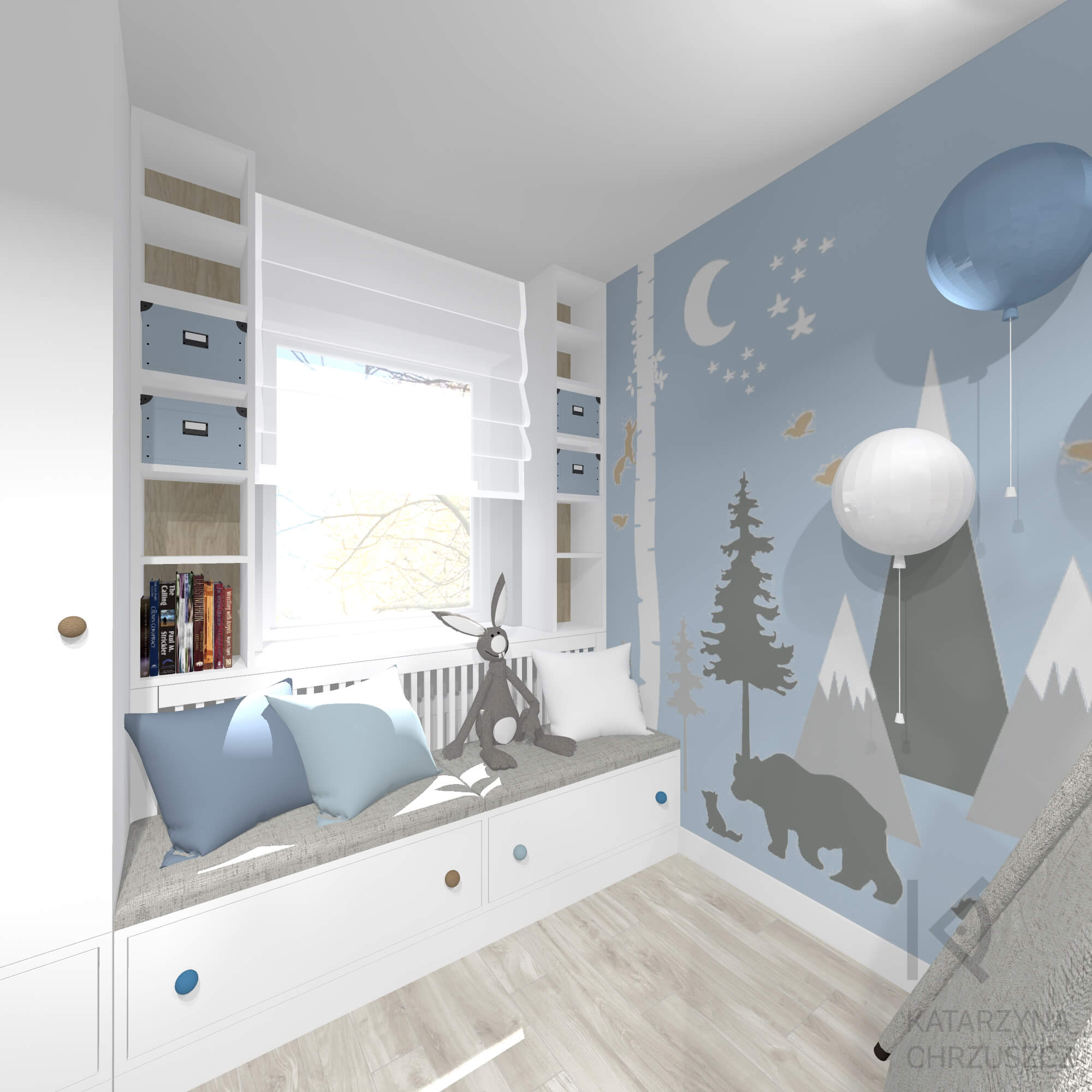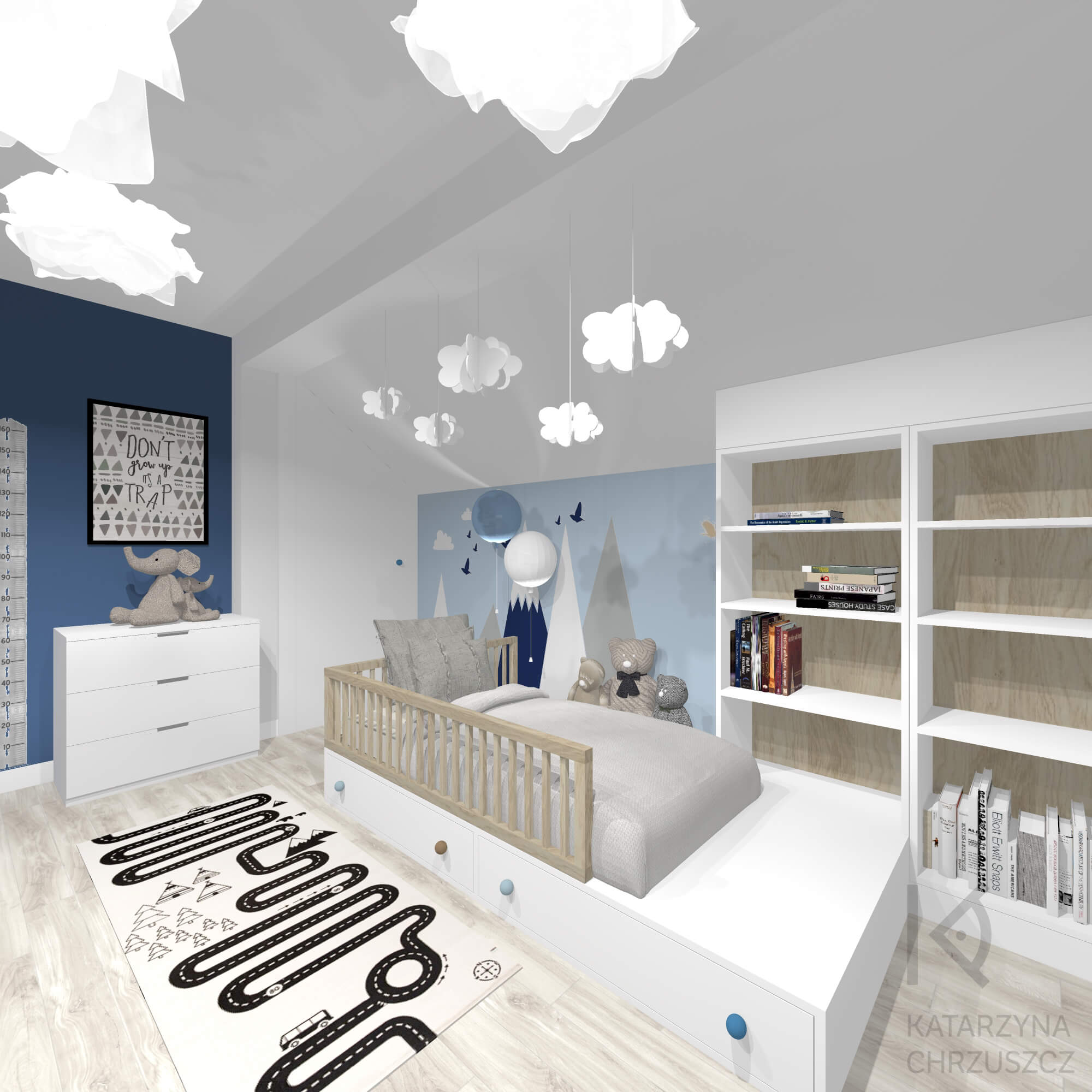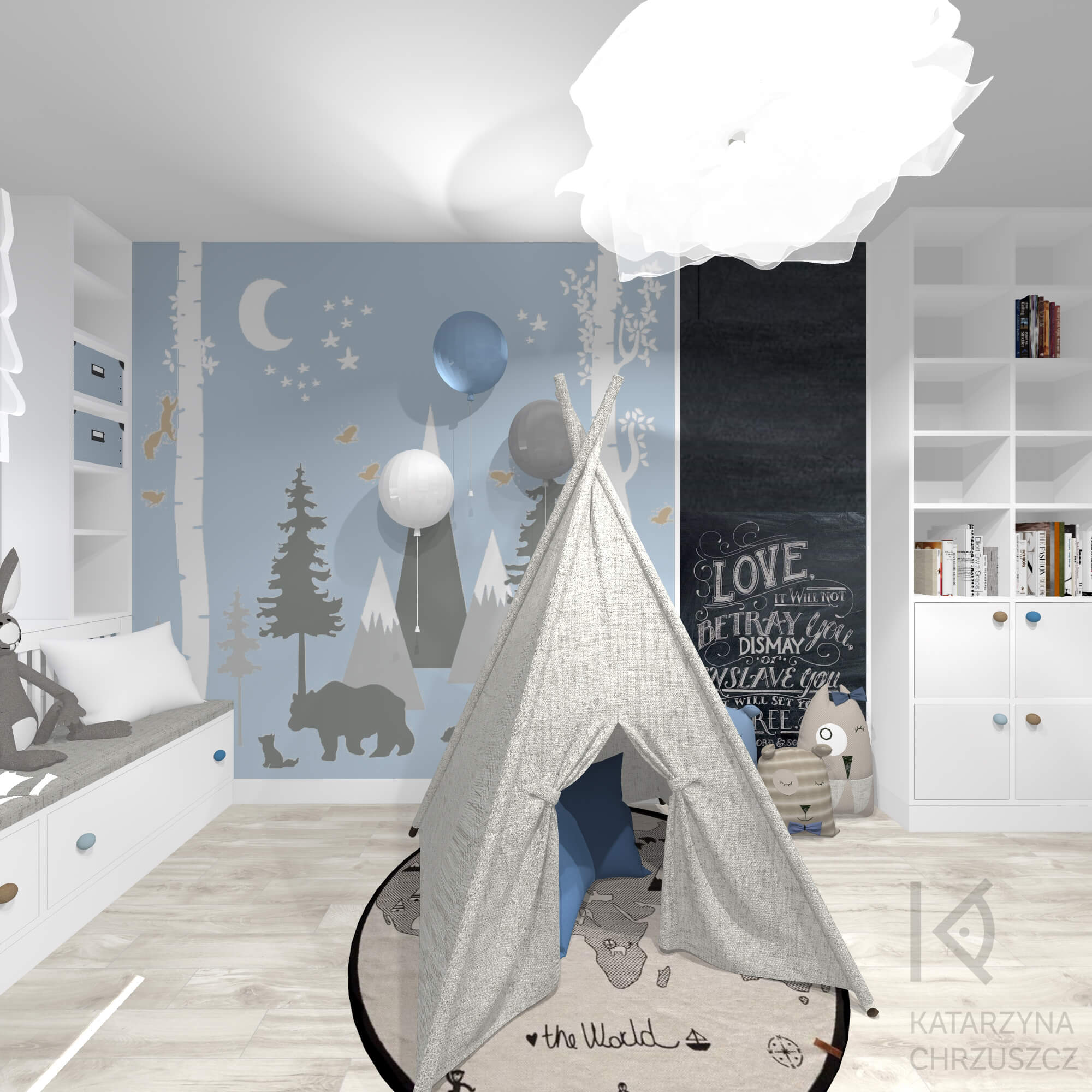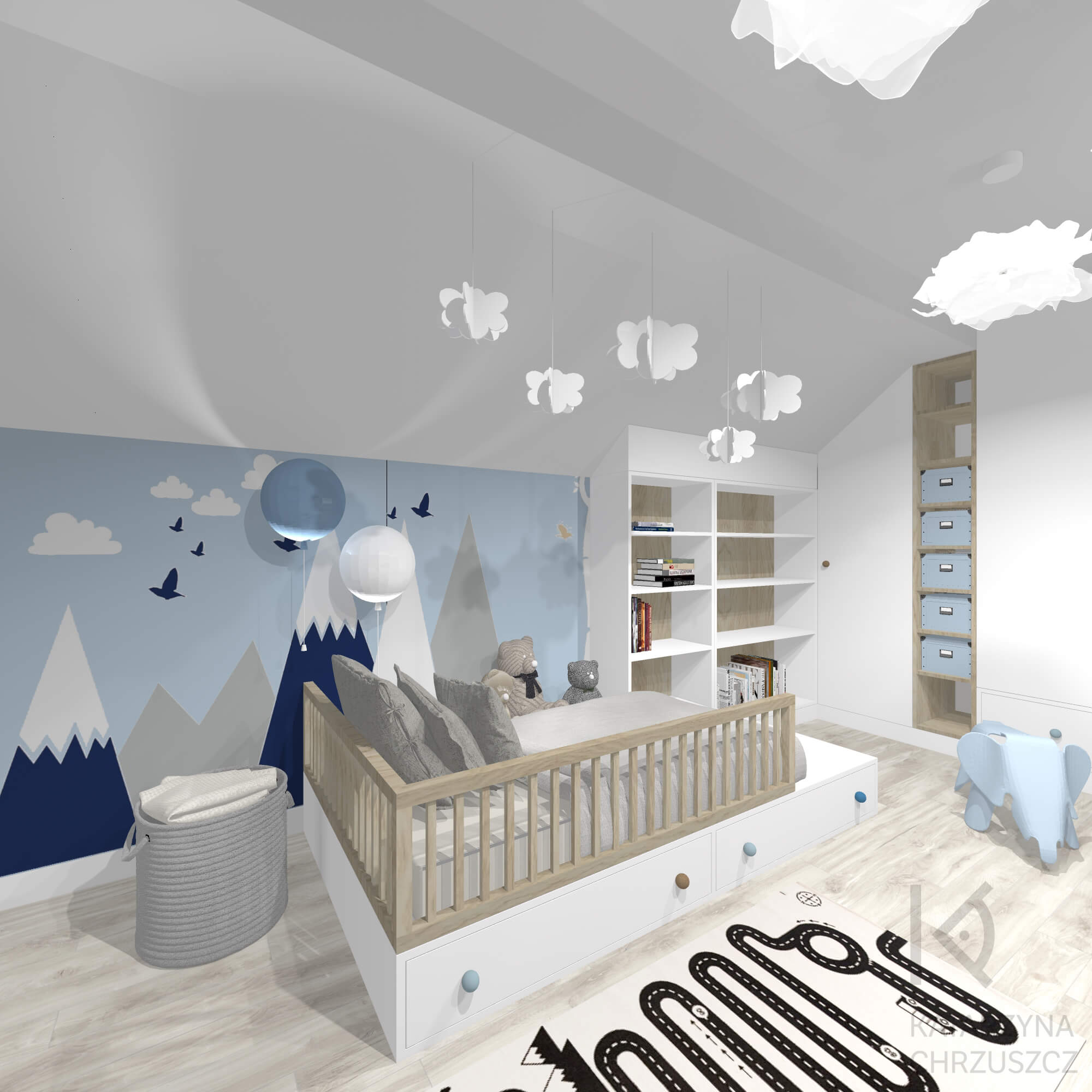 Ten wyjątkowy pokój chłopca to przestrzeń, w której dziecięca wyobraźnia spotyka się z funkcjonalnym designem, tworząc bezpieczne i inspirujące miejsce do codziennych przygód. Moja aranżacja opiera się na spokojnej, błękitnej palecie barw, która wprowadza do wnętrza lekkość i harmonię. Dominującym motywem przewodnim jest świat natury – ścienne ilustracje przedstawiające góry, drzewa i leśne zwierzęta tworzą bajkową scenerię, pobudzającą kreatywność i zachęcającą do zabawy.